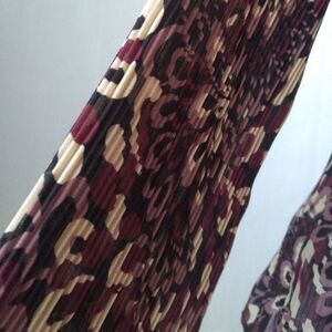 Button up black, purple, burgandy and cream floral blouse, long sleeves, wide at the bottom. Crinkly looking fabric