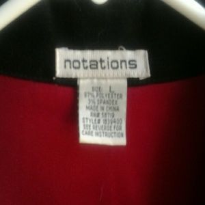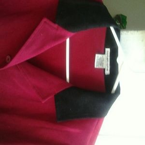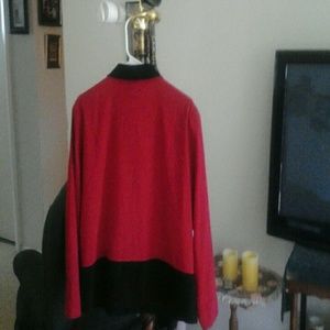97% p,olyester, 3% spandex, very soft fabric, beautiful red w/black color and black bottom of garmet, very loved, still very good condition, hangs down past waist to hip area, no fading anywhere, has small/thin shoulder pads, you can remove if want! Needs to be loved again!