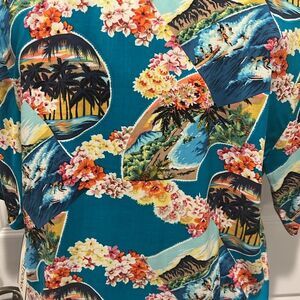 Notations vintage Hawaiian print short sleeve button down blouse with matching elastic waist pull on pants.