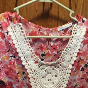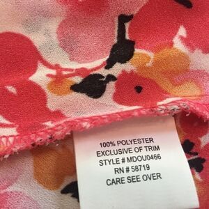 Notations brand pink floral print blouse with ruffled short sleeves. Women’s size SmallCream accent overlay at rounded neckline. Keyhole closure with button on back side. Asymetrical hemline accent. Silky-feeling polyester on this feminine blouse. Another piece that can go to work with dress slacks or skirt, or be equally at home with black jeans or ankle slacks! Showing photos of front and back sides along with fiber contents tag.