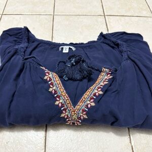 Notch Neck Polyester Peasant Top, Navy Blue with drawstring ties at the notch neckline and three-quarter sleeves with elastic cuffs.