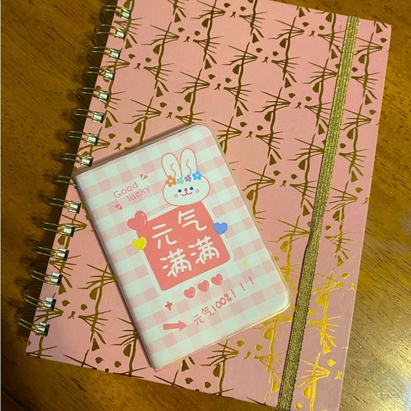NWT! Large sized, pink and gold kitty cat spiral notebook with gold elastic band, and a mini pink bunny notebook with decorative pages. Offers welcome!