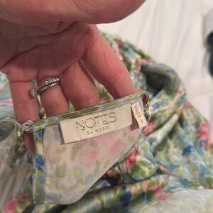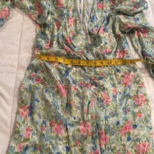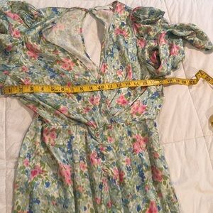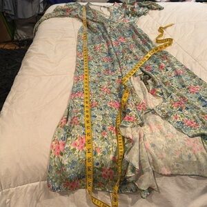 Zipper on the side. 92% silk 8% spandex. Very nicer flower dress. Green yellow pink blue white size 40 that’s like a size 10