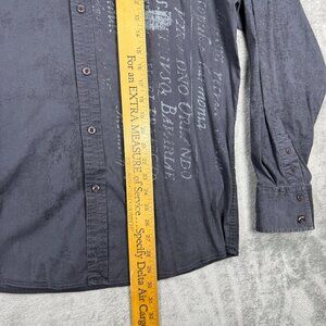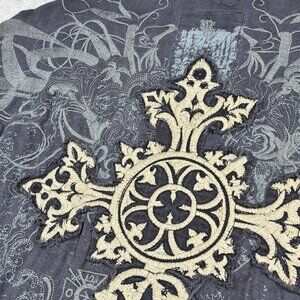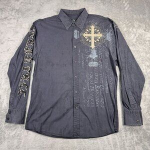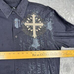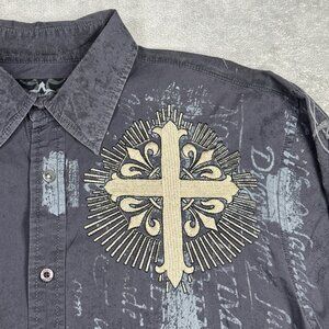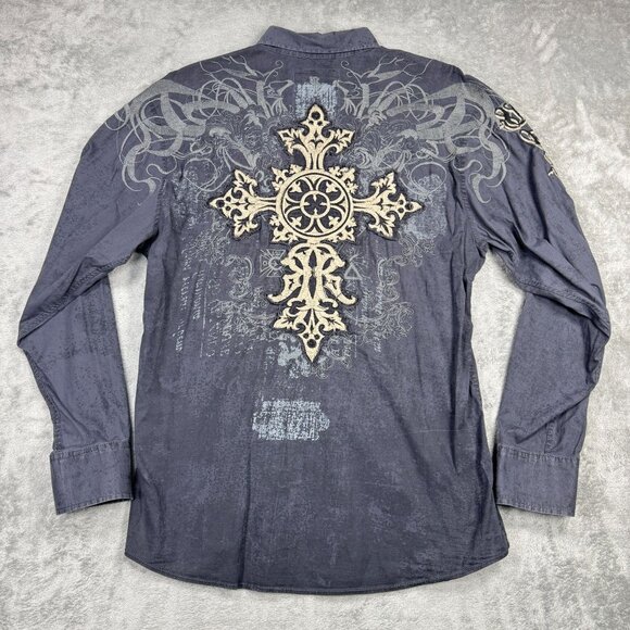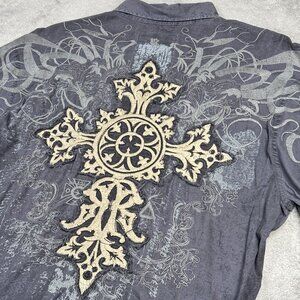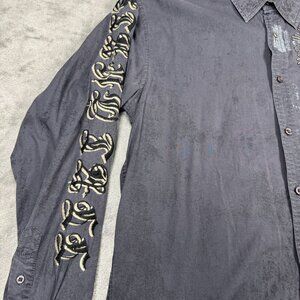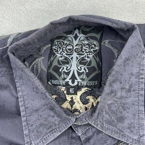 Roar stretch button up long sleeve shirt in a gray distressed stone wash look. Insane embroidery and stitched celtic cross on back. Grunge, rocker, punk style.