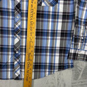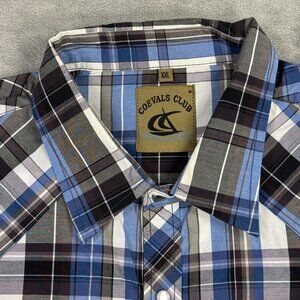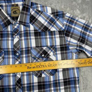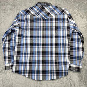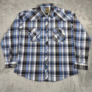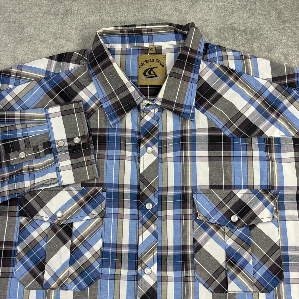 Coevals Club Pearl Snap Western Shirt Button Up Long Sleeve in plaid blue/gray/white with chest flap Pockets.