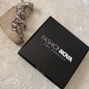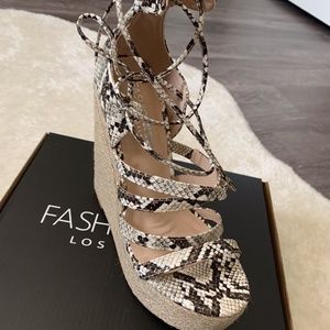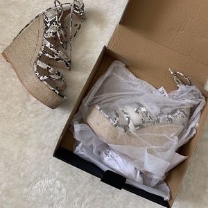 brand new never been worn platform wedge heels with snake print straps in original box and packaging