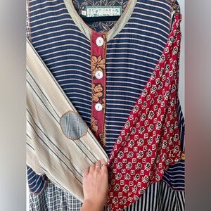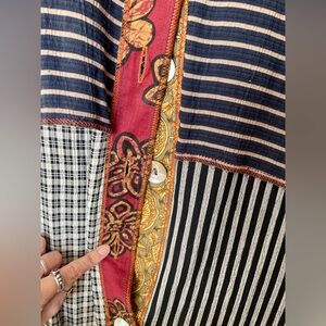 Measures approximately 20” shoulder to shoulder, 28” pit to pit, 35” shoulder to bottom. Labeled size 2, not sure if that is unique sizing to the brand or if it is indicating 2x. I’ve worn oversized as an XS! Good used condition. Missing second button from bottom, and has some tiny stains, have not tried to lift.