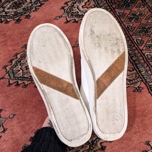 Made in Portugal from upcycled Italian leather & other sustainable materials. Very soft and supple. Clean white with gold accents. Worn only 2 or 3 times. NOTE: this is a size 8.5 but it fits more like an 8.