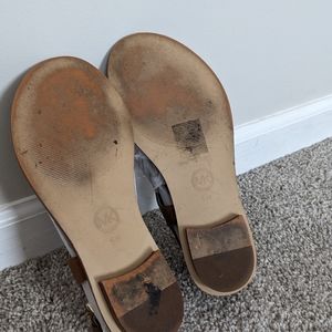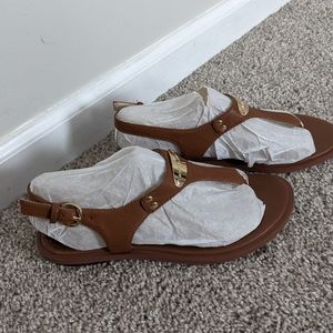 brown with gold emblem, buckle enclosure, drown bottom, leather, size 6