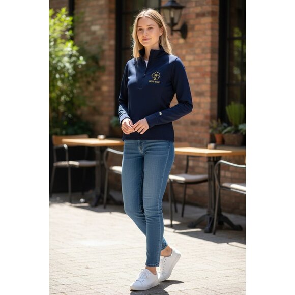 Style: Womens semi-fitted ColdGear quarter-zip pullover shirt jacket in navy with Notre Dame Fighting Irish shamrock logo at left chest and Under Armour logo at left sleeve.
