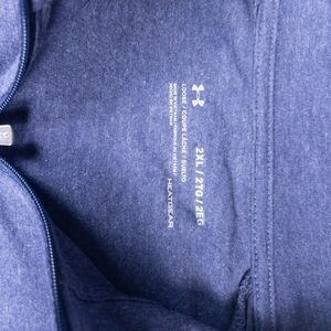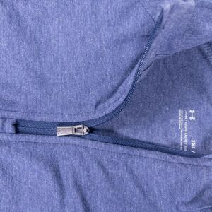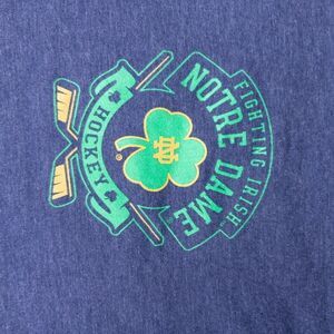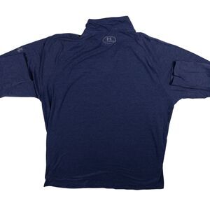 Mens Under Armour HeatGear quarter-zip performance shirt featuring the official Notre Dame Fighting Irish Hockey logo. UA Charged fabric, lightweight stretch, heathered navy color, and a relaxed loose fit for training or casual wear. Tagged Mens 2XL. See pics for measurements.