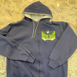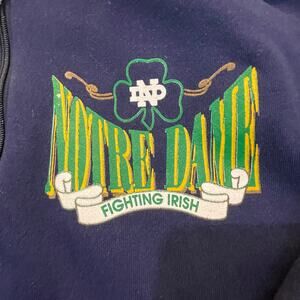 Vintage Notre Dame Hoodie in size large. Made in the USA. Navy blue full zip hoodie with two front pockets. Notre Dame logo printed on left side.