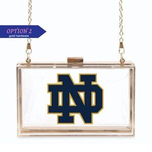 Stylish clear acrylic clutch with Notre Dame graphic. Perfect for game day!