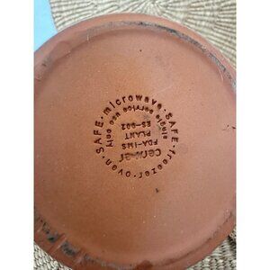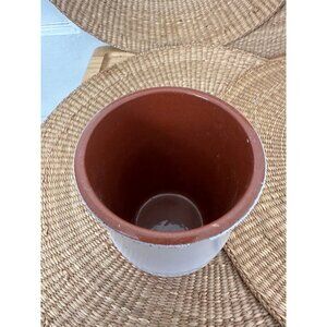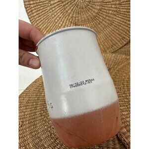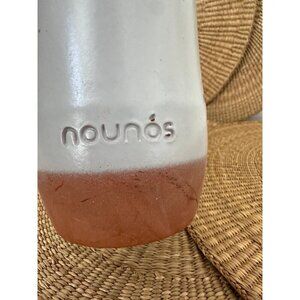 Nounós reusable ceramic yogurt pot with a white glazed upper and natural terracotta base. Stamped with the brand name and marked as microwave, oven, and freezer safe. Perfect for repurposing as a planter, storage jar, or decorative piece. Shows minor wear with a small chip on the rim.