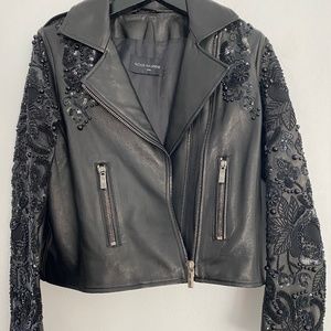 Sophia Zip-Front Lambskin Leather Jacket w/ Studded Embroidered Sleeves