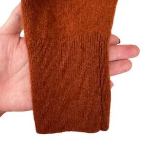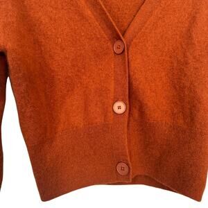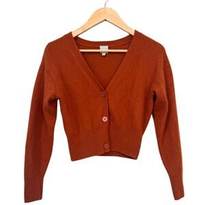 Up for sale: a Nouveaux boxy cashmere cardigan (size Small) in a warm rust/copper hue. This luxurious piece is made of 100% cashmere (label reads “dry clean only”) and features a cropped, boxy silhouette with front buttons and a flattering V-neck.
