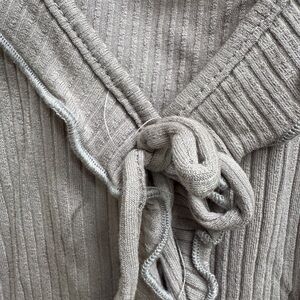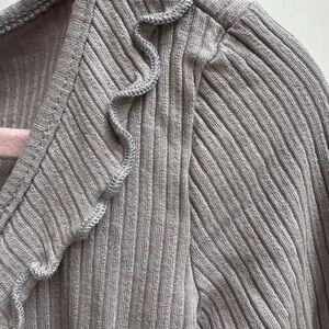 Charming gray ruffle sweater by . Perfect for adding a touch of elegance to any outfit.