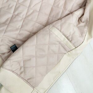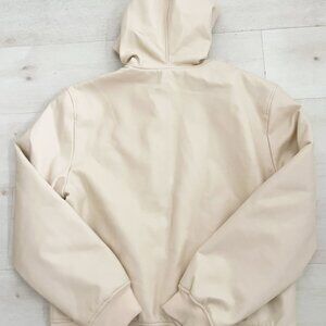 This Nova Men Faux Vanilla Hooded Leather Bomber Jacket is size large. This jacket is 92% polyester and 8% cotton. A quilted lining is 100% polyester. The jacket is medium weight and leather-like (faux leather fabric.) It is in excellent condition.