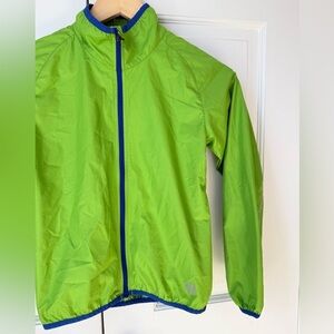 Green with blue details. Technically a cycling jacket, with reflective trim on sleeves, but versatile. Very lightweight/packable. Rear zippered pockets. Perfect for the spring, cooler summer days, traveling to cooler locations or to take to summer camp.
