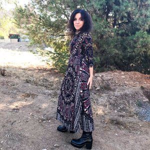 Beautiful swirls of purples and black and cream form round patterns called dials. This dress can be worn with chunky heels or slides or sneakers. Just add your beautiful self for a real show stopper. NWT.