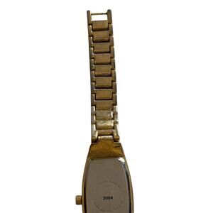 This Novelle wristwatch for women features a gold tone rectangular case with a gold dial and a rhinestone band. It is powered by a quartz movement made in Japan. The watch includes features like a mineral crystal, seconds hand, 12-hour dial, and push/pull crown. The case is made of stainless steel with a snap caseback. It has an analog display and a metal band in gold color. Original box/packaging and papers are not included.