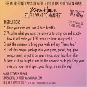 Each 3 x 3 package comes with a manifesting card and instructions on how to manifest, plus a super attractor Magical Power Object to carry with you or pin to your vision board to make it come true. You can keep it all together in the bag or carry the Magical Power Object in your purse or pocket separately! Slip it into greeting cards, gifts, pockets or purses. Attach it to your vision board, mirror or altar.