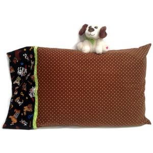 Cozy soft pillowcase is made with cotton chocolate brown flannel print with small lime polka dots. Bordered with cotton print depicting comic dogs dressed to play.