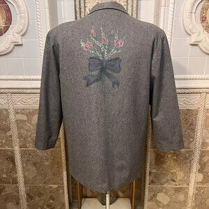 Novelty Hand Painted Bunny Rabbit Wool Jacket. Size L-!X. Paisley Polyester Lining. Tag says large but if you notice the bust measurement it should fit up to a 1X. Shoulder to hem 31.5". Sleeve 23.5". Bust 24/48". 3 pockets. Gray. I am a retired buyer for a quality boutique. I use Downey and Bounce in my laundry. Unless noted you are purchasing USED CLOTHING with normal signs of wear. Questions welcome. Color is a matter of opinion and monitors may show colors differently. Measurements are approximate using a tailor's tape. Bust measurements are taken armpit to armpit laying flat X two. Check measurements carefully with regard to your PREFERRED EASE.
