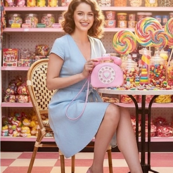 Vintage Rotary Phone Purse - Pastel pink crossbody Bag with Adjustable Strap, Retro Telephone Handbag for, Cute Party/Everyday Bag with Non-Electrical Design - Weird & Wonderful Retro Accessory, Phone Bag, Party Accessory, Embellished with Heart Buttons, Casual Outing, Playful Style, Durable Polyester Lining, Statement Accessory,