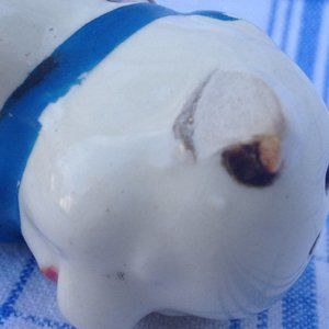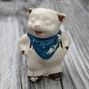 Vintage set of novelty pig salt and pepper shakers in fair condition measuring approximately 3 1/4"H x 2 1/2"L x 2"W. Corks still intact on the bottom - one has a little CHIP in the cork. Paint is RUBBED OFF in several places and blue neckerchief pig has a CHIP on his ear. Adorable to display in your vintage kitchen or dining room. Collectible. From a smoke-free home. Offers welcome.