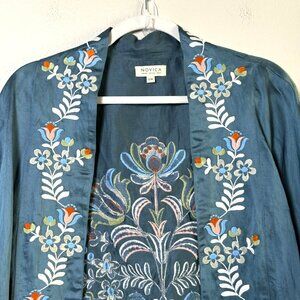 Novica Azure Autumn Floral Embroidered Kimono Jacket Size S M Blue Birds Pockets