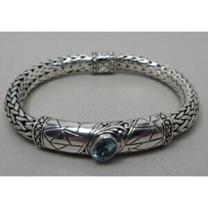 A thick sterling braid encircles the wrist to become a trendy bracelet. Designed by Putu Gede Darmawan, it is centered by an engraved silver tube. A faceted blue topaz adds color to the handcrafted bracelet and totals 3 carats.