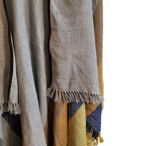 Soft, warm and lightweight, this 100% baby alpaca ruana is trimmed in brown suede and finished with a delicate fringe will be your go-to layer for chilly days. Open front wrap wide swathes of tan, gold, indigo and grey, reminiscent of the subtle colors of nature during the changing seasons.