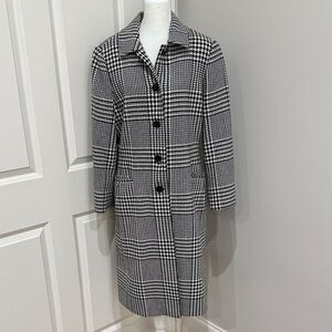 Elevate your style with this classic black and white houndstooth coat. Perfect for any occasion, this coat offers both warmth and sophistication.