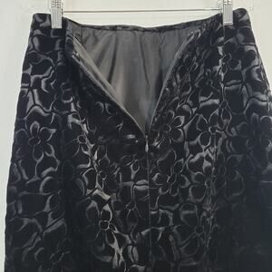 Noviello-Bloom velvet blazer and skirt set in black with a floral pattern and a ruffle trim made in the USA. The buttons on the blazer are on the inside, concealing them. The skirt has a 9.5 inch slit on the front left and a zipper closure in the back. There are no pockets.