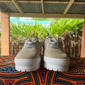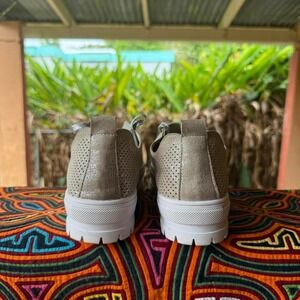 beige suede, metallic laces, chunky sole, perforated texture, shimmer finish, platform sneakers, lightly worn, minimalist design, sporty chic, neutral tone