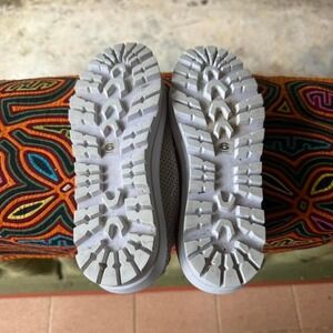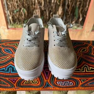 Beige suede with subtle silver shimmer ✨ and metallic laces. Chunky sole, perforated texture, lightly worn soles only.