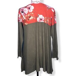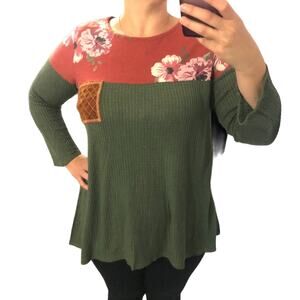 Now N Forever (M) Floral Colorblock Waffle Knit 3/4 Sleeve Top Suede Pocket
