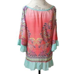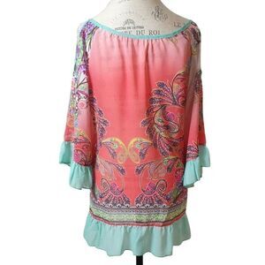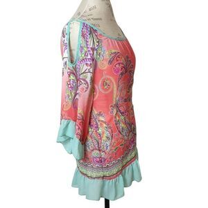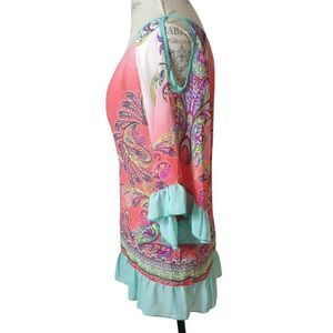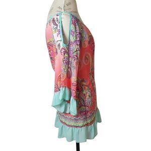 Now N Forever Cold Shoulder Blouse XL Pink Teal Paisley Print Ruffle Trim Fairy