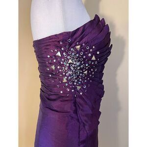 Sexy purple strapless dress with decorative pleats as well as rhinestones, beading, and sequins. Lots of ruching, and the bust is lightly padded. Zippered back. Lined