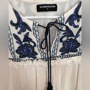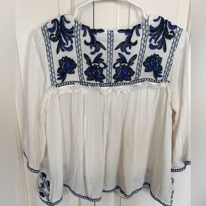 Nu Construction Boho Embroidered White and Blue Blouse Size Small