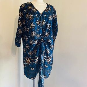 Midi Nu New York Dress with a orange, cream, blue and black print. Size: Small. 3/4 length sleeves. Can be tied in front of stomach or back. Very lightweight! 100% Polyester.