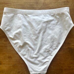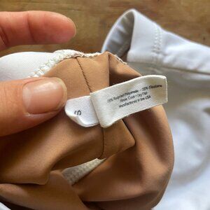 I think the color is bone? It's a cool white.. Size small. High waist, slightly high cut legs. Great fit!