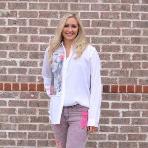 This vintage inspired boot cut jeans feature a beautiful distressed, dusty purple color with amazing give and stretch material. The jeans are accentuated with a stunning custom patchwork/ artwork added to left front pocket and bottom front and back of both legs.
