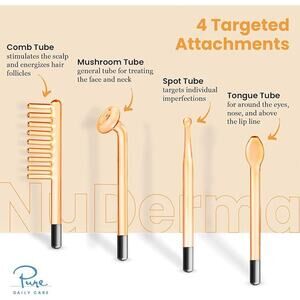 1 NuDerma Device, Neon powered mushroom wand, Neon powered spot wand, Neon powered comb wand, neon powered tongue wand, quick-start treatment guides, instructions.