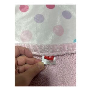 Pink polka dot baby blanket from Nuby. Back is a light pink Sherpa fabric, front is a soft polka dot fabric. No stains or holes, some matting and wee to the Sherpa back.