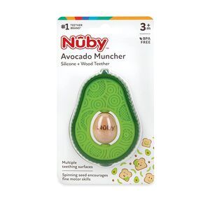 This adorable Nuby Avocado Teether is perfect for your little one, aged 3 months and up! Made from soft, baby-safe silicone, it's gentle on gums and helps soothe teething discomfort. The unique avocado shape is easy for tiny hands to hold and explore. Plus, the fun spinning wood seed adds an extra element of play.