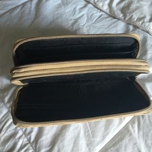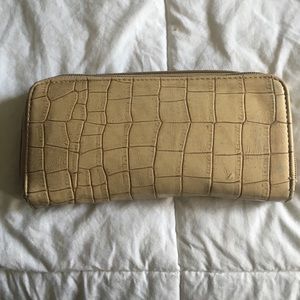 Nude, perfect color. Alligator type pattern. Matching wallet included. Wallet has two compartments hold a lot of cards and cash. Get the perfect bag today!
