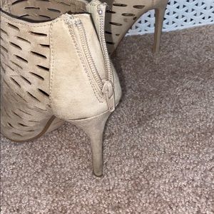 Nude colored boot, open-toed heels. Used, no damage. Zippers up in back.