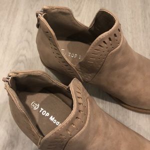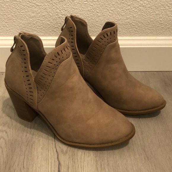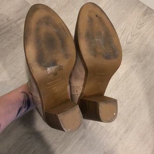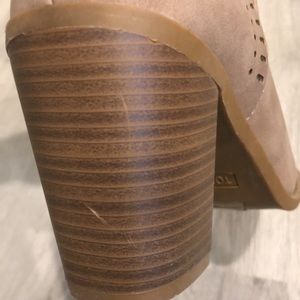 Nude color booties. Used twice. Still in very good condition. Zipper closure in back. A few scuff marks on the heels. See pictures 6 & 7 for left heel scuff marks. See picture 8 for right heel scuff marks.